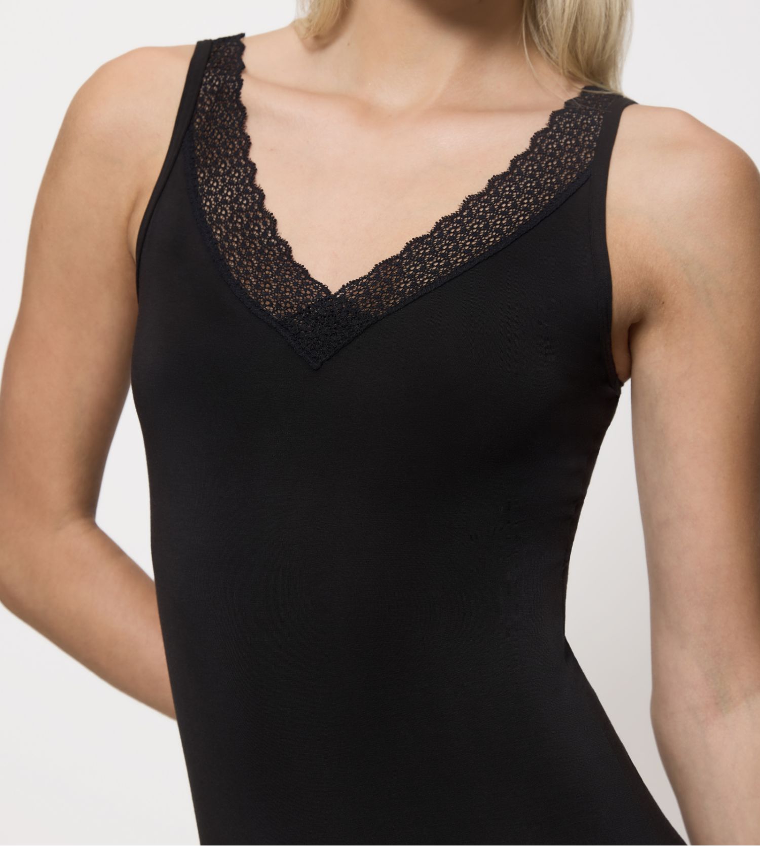 - Décolleté en V avec dentelle.