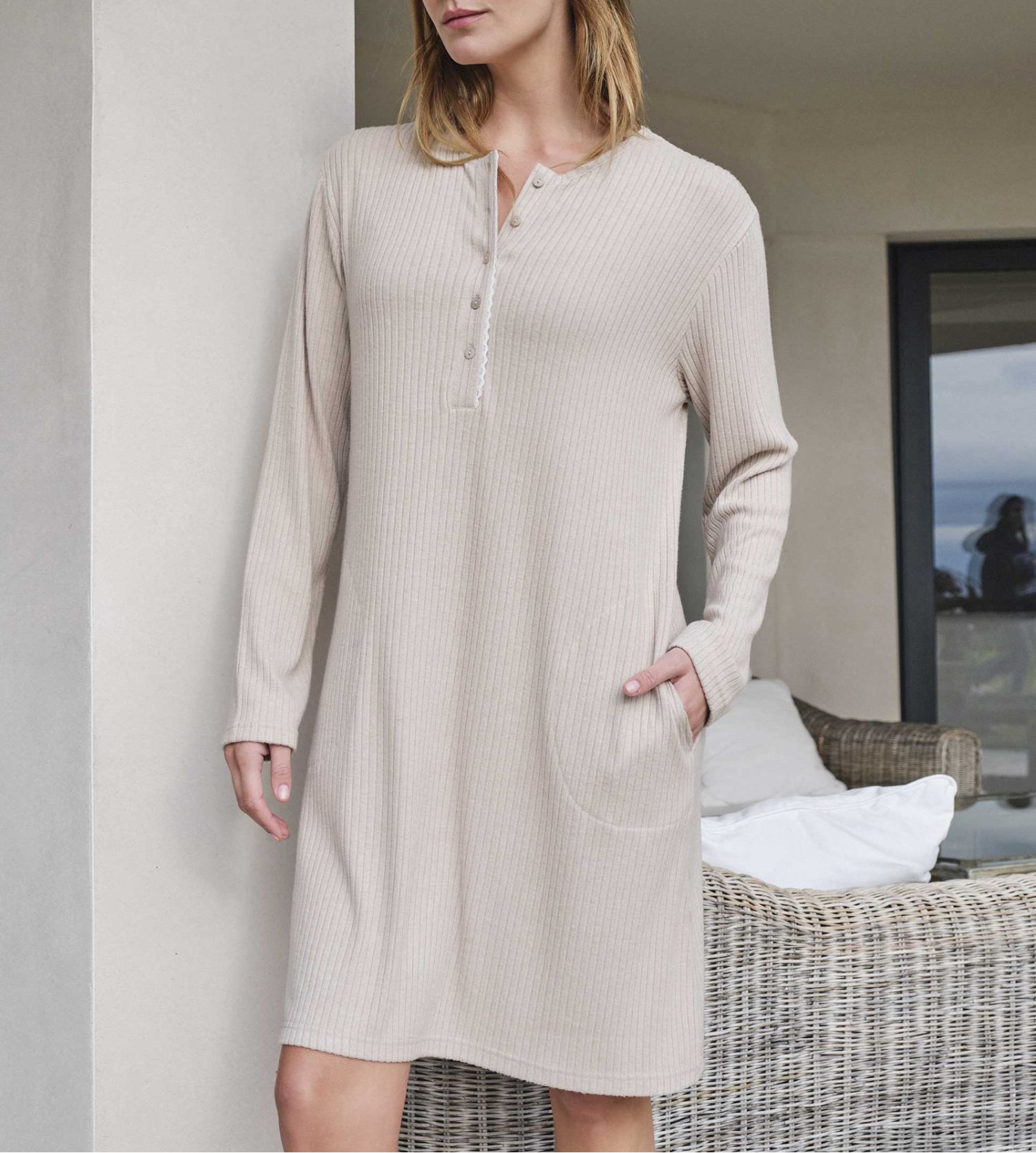 La liquette Massana côtelée enveloppe la silhouette de douceur et de chaleur. Son imprimé uni beige lui confère un style cocooning, parfait pour les soirées d’hiver.