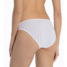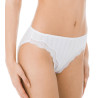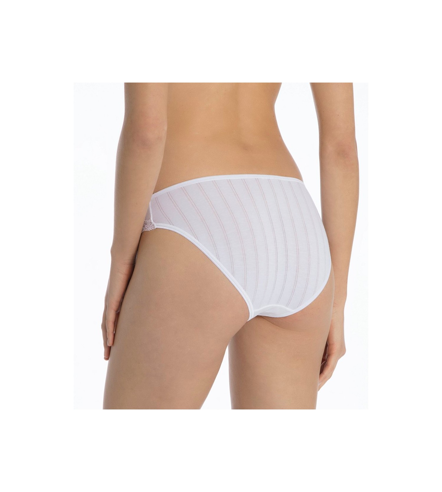 Slip Calida en fin mille-raies décoré de dentelle de Dresde, dentelle douce à l'échancrure et petit noeud de satin sur le devant, lui donnant un coté vintage. Confort toujours au rendez-vous, grâce à sa coupe régular et à la matière de coton Supima® de qualité exceptionnelle.