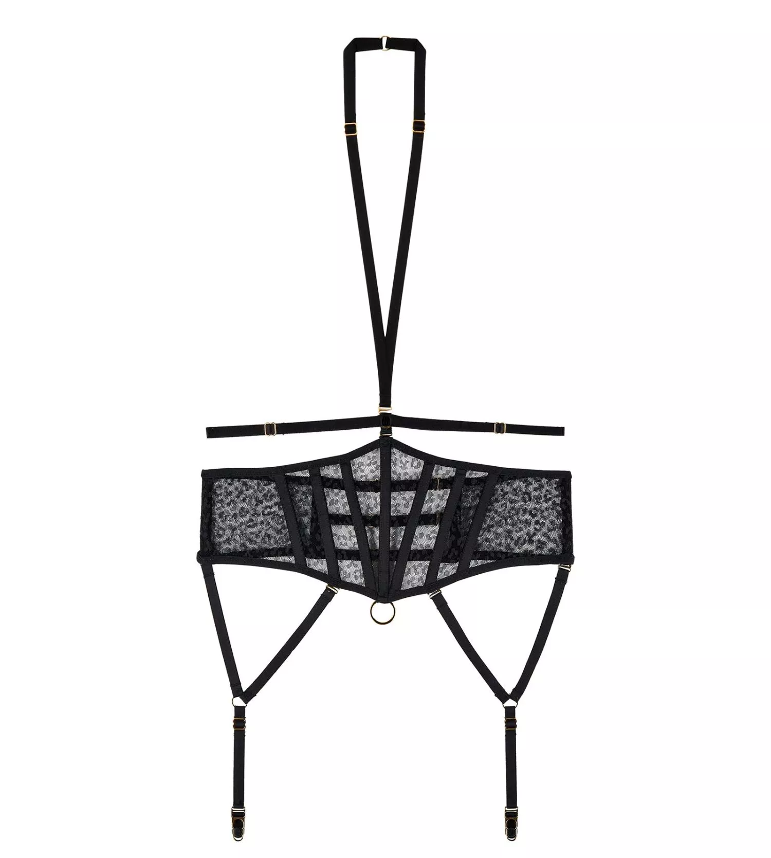 - Le serre-taille peut se porter de multiples façons avec ses jarretelles et son harnais amovibles. L’anneau sur le devant est un subtil clin d’oeil à l’univers du bondage.