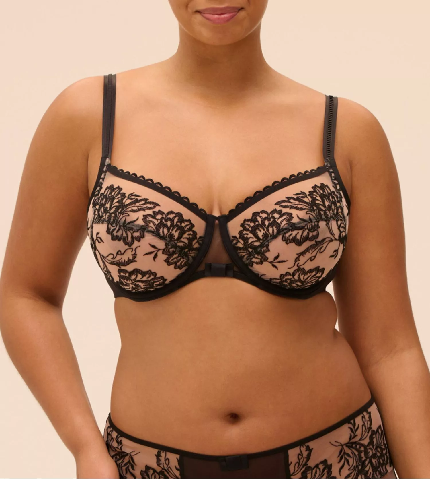 Romance | A haunting line with these details gently embroidered on semi transparent tulle. The modern tattoo effect suggests the skin for a chic and seductive look. An eco-friendly collection that is part of the program Simone Cares Thanks to its embroidery fully created with recycled fibers.